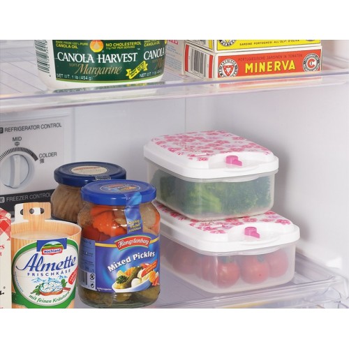 Во время хранения в холодильнике занимает мало места, так как красиво складываются друг на друга. Так как видно содержание, очень удобно. Можно использовать в микроволновой печи, сняв крышку.